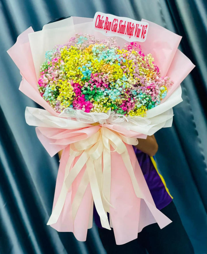 Bó hoa được tạo thành hoàn toàn từ hoa baby nhuộm nhiều màu, phối thành một bảng màu rực rỡ nhưng vẫn mềm mại: