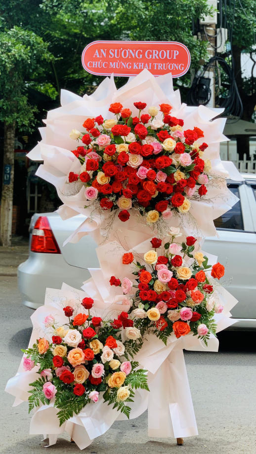 Phần chân kệ sử dụng giấy gói trắng tinh, xếp tầng tạo độ phồng, mang lại vẻ thanh lịch, hiện đại. Tổng thể kệ hoa mang vẻ đẹp sang trọng – tươi sáng – chúc mừng tràn đầy ý nghĩa.
