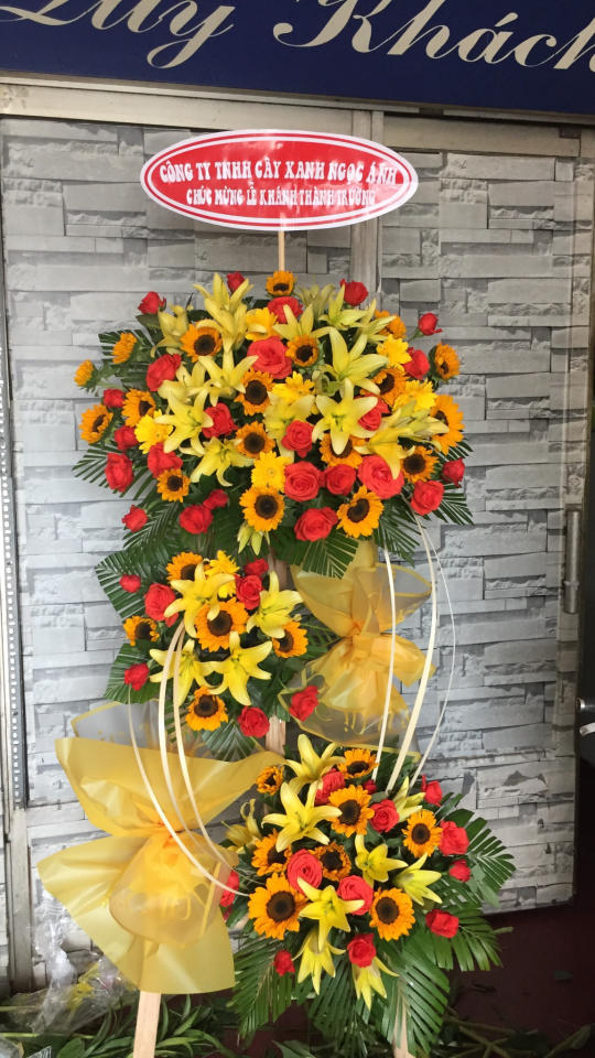 • Phụ kiện: 2 nơ voan vàng bản lớn buộc giữa và chân kệ; bảng chúc mừng oval đỏ phía trên, dễ cá nhân hóa tên người/đơn vị gửi.