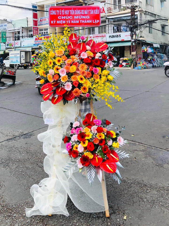 Kệ hoa trong hình là một kệ hoa khai trương dạng 2 tầng, phối màu rực rỡ và sang trọng: