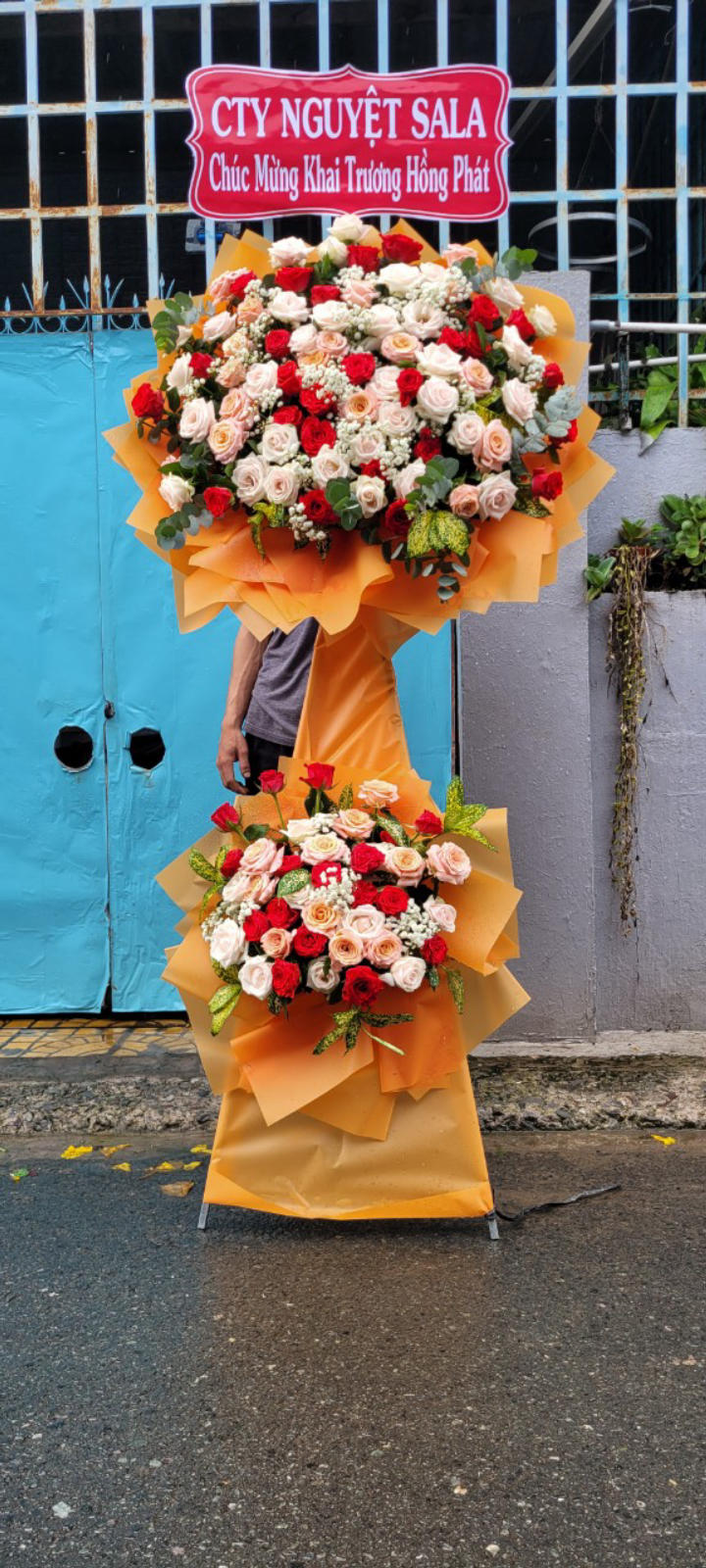 Kệ hoa chúc mừng – cam vàng – đỏ trang nhã