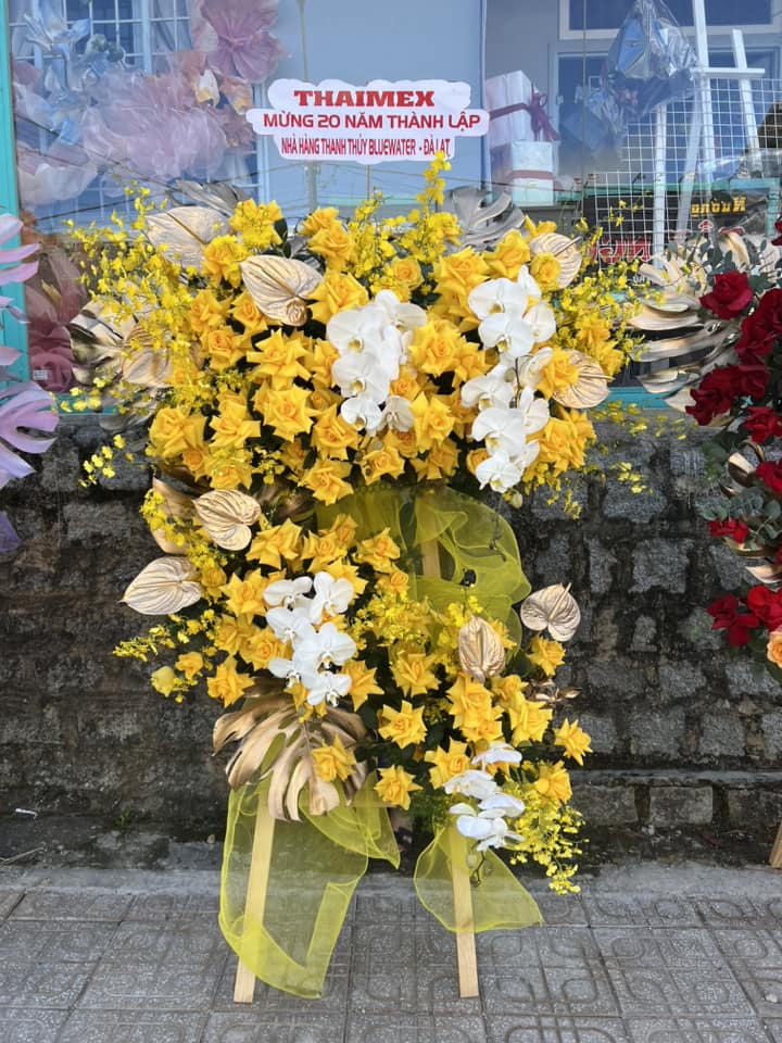 Kệ được dựng trên chân gỗ cao, hoa được cắm theo phom trải rộng – tán lớn, tạo độ bề thế và thu hút khi nhìn từ xa.