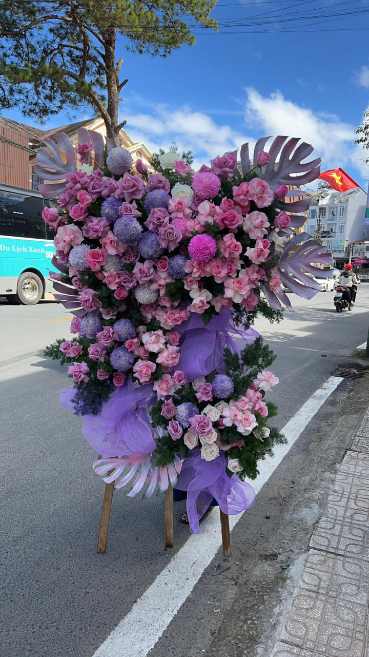 Phần thân kệ quấn lụa tím nhạt, bổ trợ hoàn hảo cho tông màu hoa, tạo sự đồng điệu và tinh tế.