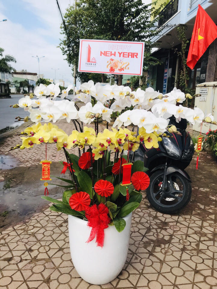 Chậu hoa là một chậu lan hồ điệp lớn đặt ngoài vỉa hè, rất nổi bật: