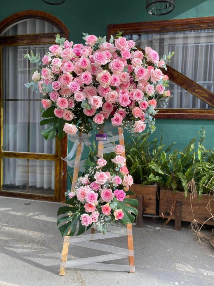 Kệ hoa được thiết kế theo mẫu hai tầng, sử dụng chân gỗ chữ A thanh lịch và hiện đại. Tổng thể mang phom tròn phồng – bung xòe ở tầng trên và cụm hoa nhỏ đồng điệu ở tầng dưới.