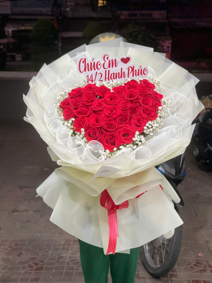 Bó hoa có hình trái tim lớn ở trung tâm, nổi bật giữa lớp giấy gói trắng sang trọng.