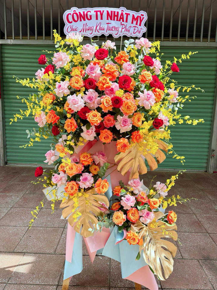 Kệ hoa mang màu sắc rực rỡ và không khí tươi vui, thể hiện sự may mắn, hồng phát và thịnh vượng. Gam màu cam – đỏ – hồng được phối khéo léo tạo cảm giác năng động nhưng vẫn thanh lịch. Lá nhũ vàng và lan mokara giúp kệ hoa trở thành lựa chọn hoàn hảo cho các dịp như khai trương cửa hàng, chúc mừng doanh nghiệp, kỷ niệm hoặc sự kiện quan trọng.