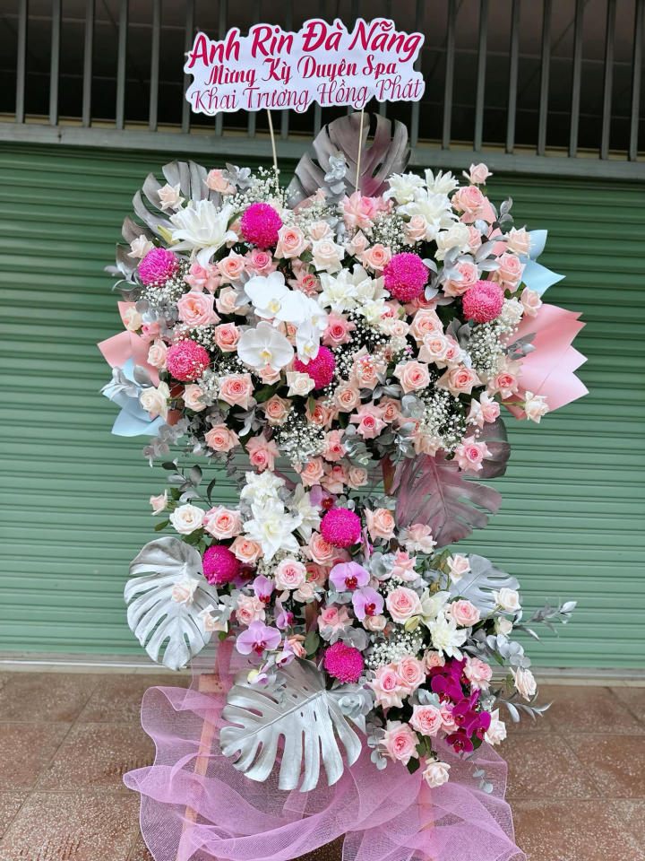 Sắc hồng pastel tượng trưng cho sự duyên dáng và khởi đầu đẹp. Màu trắng thể hiện sự tinh tế và thuần khiết. Màu hồng đậm và tím biểu trưng cho may mắn, tài lộc và sự phát triển. Tổng thể kệ hoa mang thông điệp chúc mừng thành công, hồng phát và thịnh vượng.
