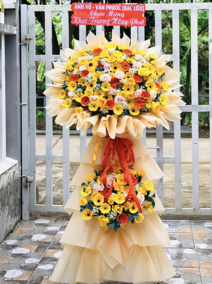 Kệ hoa chúc mừng hai tầng, tông vàng – cam trên nền giấy kem: