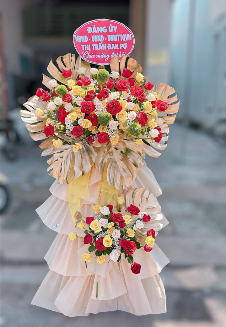 Kệ hoa nổi bật với tông đỏ – vàng – kem kết hợp cùng các lá monstera ánh vàng đồng. Đây là sự phối màu đầy năng lượng, mạnh mẽ nhưng vẫn giữ được nét trang trọng và tinh tế. Tổng thể mang phong cách tươi sáng, rạng rỡ và rất phù hợp cho các sự kiện quan trọng, đặc biệt là chúc mừng đại hội, khai trương, lễ kỷ niệm.