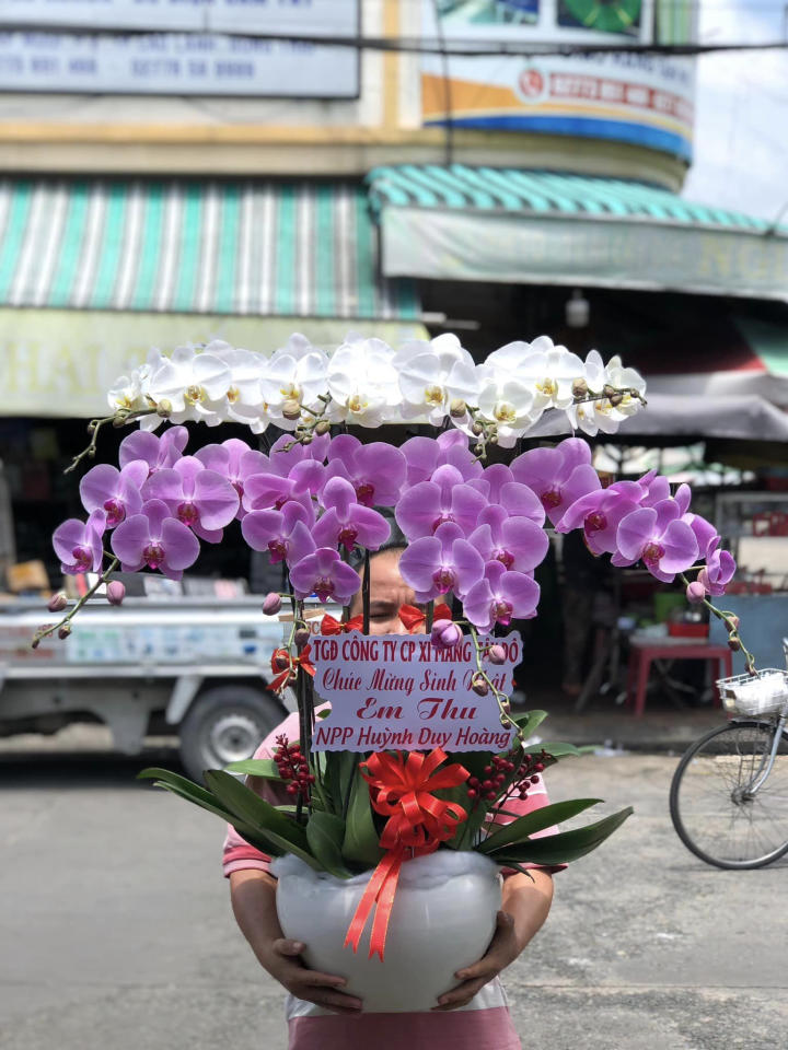 Toàn bộ được cắm trong chậu sứ trắng tròn, đang được một người nâng trên tay giữa khung cảnh đường phố, tạo cảm giác kệ hoa vừa sang trọng vừa thân thiện, rất thích hợp làm quà sinh nhật hoặc chúc mừng.