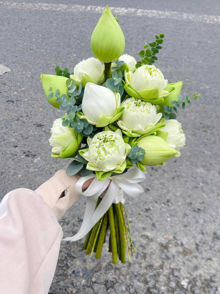 Bó hoa là một bó sen trắng cầm tay rất thanh khiết: