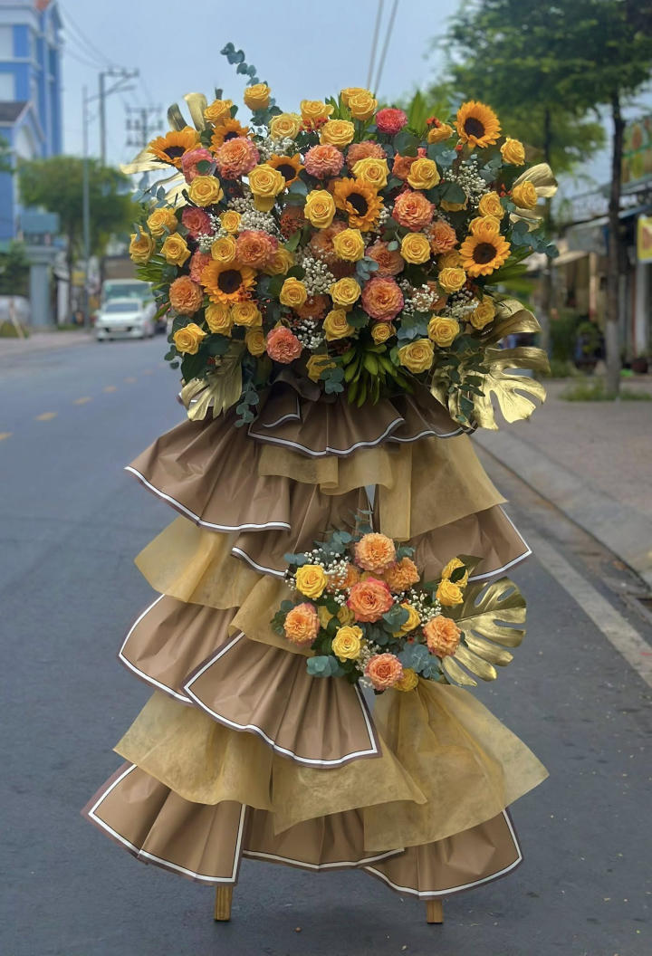 Kệ hoa là mẫu hai tầng với sắc cam – vàng – nâu nhạt làm chủ đạo, tạo vẻ đẹp ấm áp, sang trọng và cực kỳ nổi bật. Đây là kiểu kệ rất được ưa chuộng cho khai trương, vì mang ý nghĩa thịnh vượng – thành công – hanh thông.