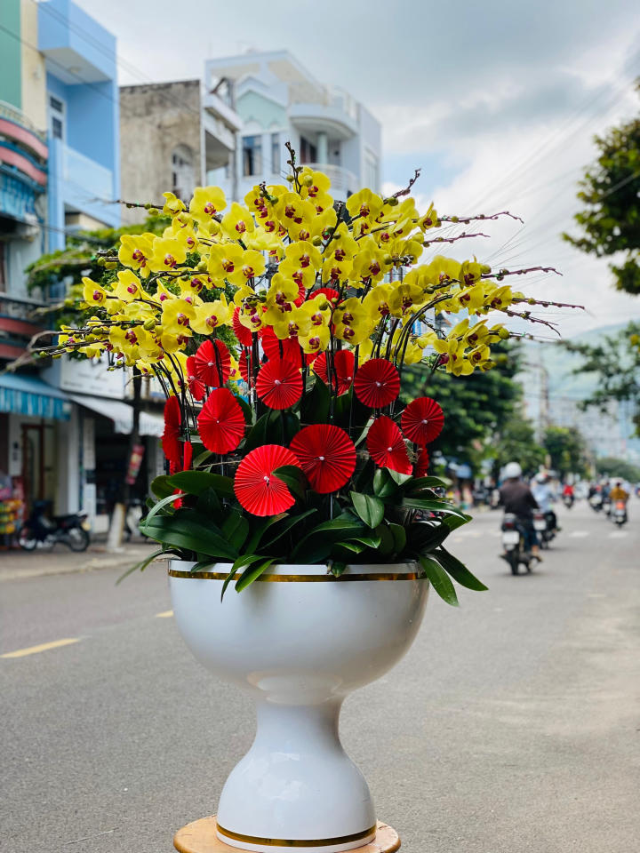 Tổng thể chậu hoa mang vẻ đẹp hoành tráng – rực rỡ – đậm không khí lễ Tết, rất thích hợp trưng bày trước cửa hàng, sảnh công ty, sân khấu sự kiện hoặc dùng làm kệ hoa khai trương, chúc mừng những dịp quan trọng.